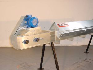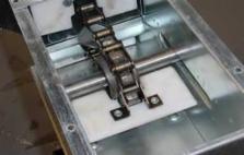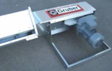 в ляво: Задвижваща станция със задвижващ мотор с мощност 2,2 kW до 5,5 kWР в дясно: Опъващо устройство и пренасяща (транспортна) верига с пластмасово гребло прихващач |