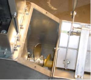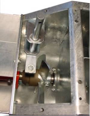 | в дясно: Регулировка на подаването на входа с изместване на шпиндела, затваря напълно притока на зърно, с което е възможен напълно празен ход на елеватора, дори при пълен зърнорезервоар. |